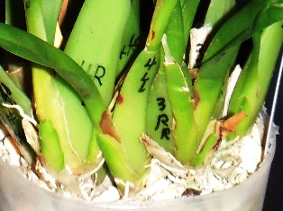 上旬冬芽#3草丈30cmバルブ8x3.5x1.3cm葉23,23cm、花茎17cm 下旬#3草丈30cmバルブ8x3.5x1.6cm葉23x3.5,23cm、花茎31cm、夏新芽#3l 1.5cm, |