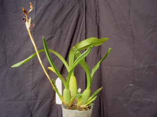 親:開花株草丈26cm,、バルブ8x2.4x0.7cm、葉21.5x3.2cm、 古バルブ7.5x2.8x0.8cm、葉なし、 |