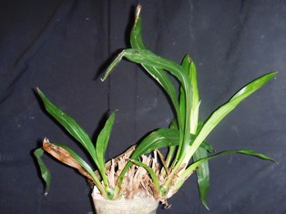 冬新芽が出てきました。親株はバルブができていなくて細いため、新芽は体に沿っています。