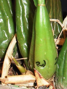 上旬春芽#4草丈24cmバルブ5.3x1.7x1.5cm 夏芽#21 5cm、#5(開花株#3の孫) 4cm 夏新芽#11 1cm分岐・群生株化 | 5 | 前半冬芽20.5バルブ3.5x0.8葉9-17,10-17.5 |