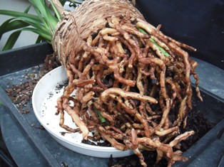 根が下向きに伸びて、底から反転してU字形になり、先が根鉢に食い込んで取れにくくなっている物だけは、先がうまく抜けない場合はやむを得ず切ります。