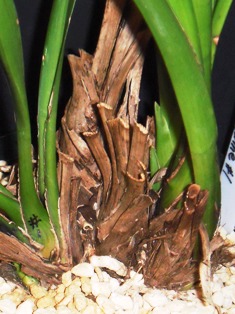次芽の周りなどに残っていた植込み材料を、特に若いバルブのこれから根が出てくる根元はきれいにして新しい土に新根が馴染むように気をつけます。