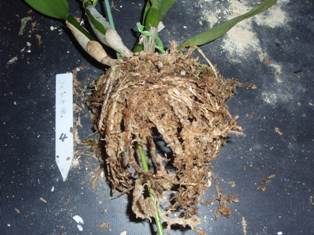 抜いて見ると、ミズゴケが古く、根は大部分が枯れたり腐ったりしています。やや健康な根の周りのミズゴケを残して後は取り除きます。