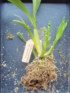 花無しなど古株11本、バルブ最長7cm最広2.8cm最厚0.7cm 子株5本、草丈最高18cm、バルブ最長7cm最広2cm最厚0.7cm バルブは小さいです |
