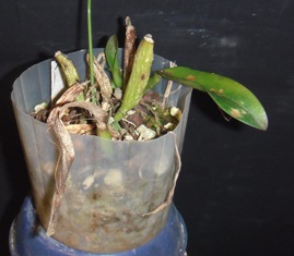中心の古くて腐ったミズゴケを残していたため、その部分の根は完全に腐っていました。霜害もあって古いバルブは枯れています。新芽2つだけは元気で葉があり新根が伸びています。