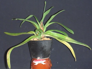 13年1月後半 黒プラ鉢径9cm、二重、丈(最長葉の長さ)19cm、葉4-5枚、葉最広3.5cm、脇芽丈18cm葉5枚