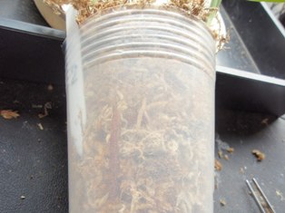 1 ミズゴケ植えを鉢から抜いた処、ミズゴケが鉢の形に固まっている、根は少なく、広い隙間がある。