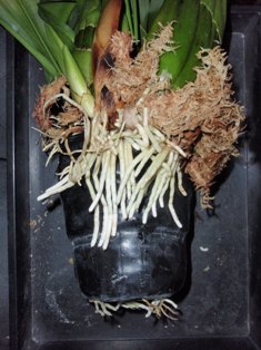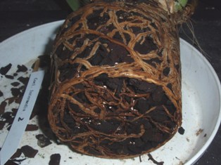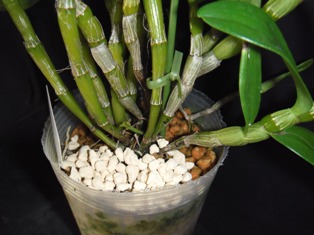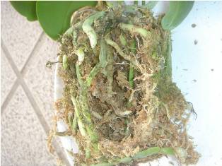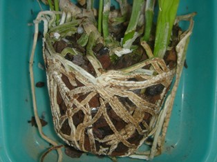 植え替えは毎年必要と言うわけではありません。しかし、新根は毎年出てきます。また、高芽からの新根は植え込み材料に届きません。夏に向かって、新しい根が植え込み材料の表面を這って伸びてきます、例えばカトレヤとか、パフィオペディルムです。さらに、元気な苗では、鉢の内側に根が伸びているのが見えます。
