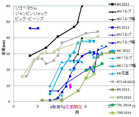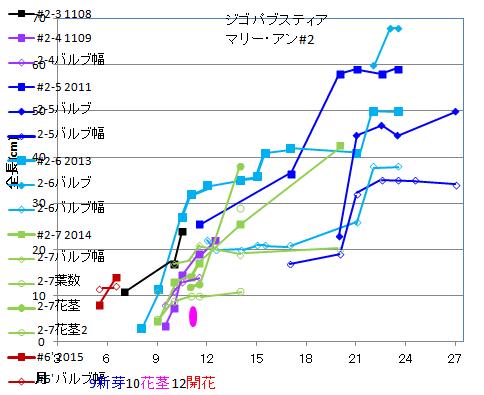 | 株# | 年月日 | 丈 | バルブ長 | 幅 | 厚 | 葉数 | 葉長 | 幅 | 花茎 | 蕾 | 花 |